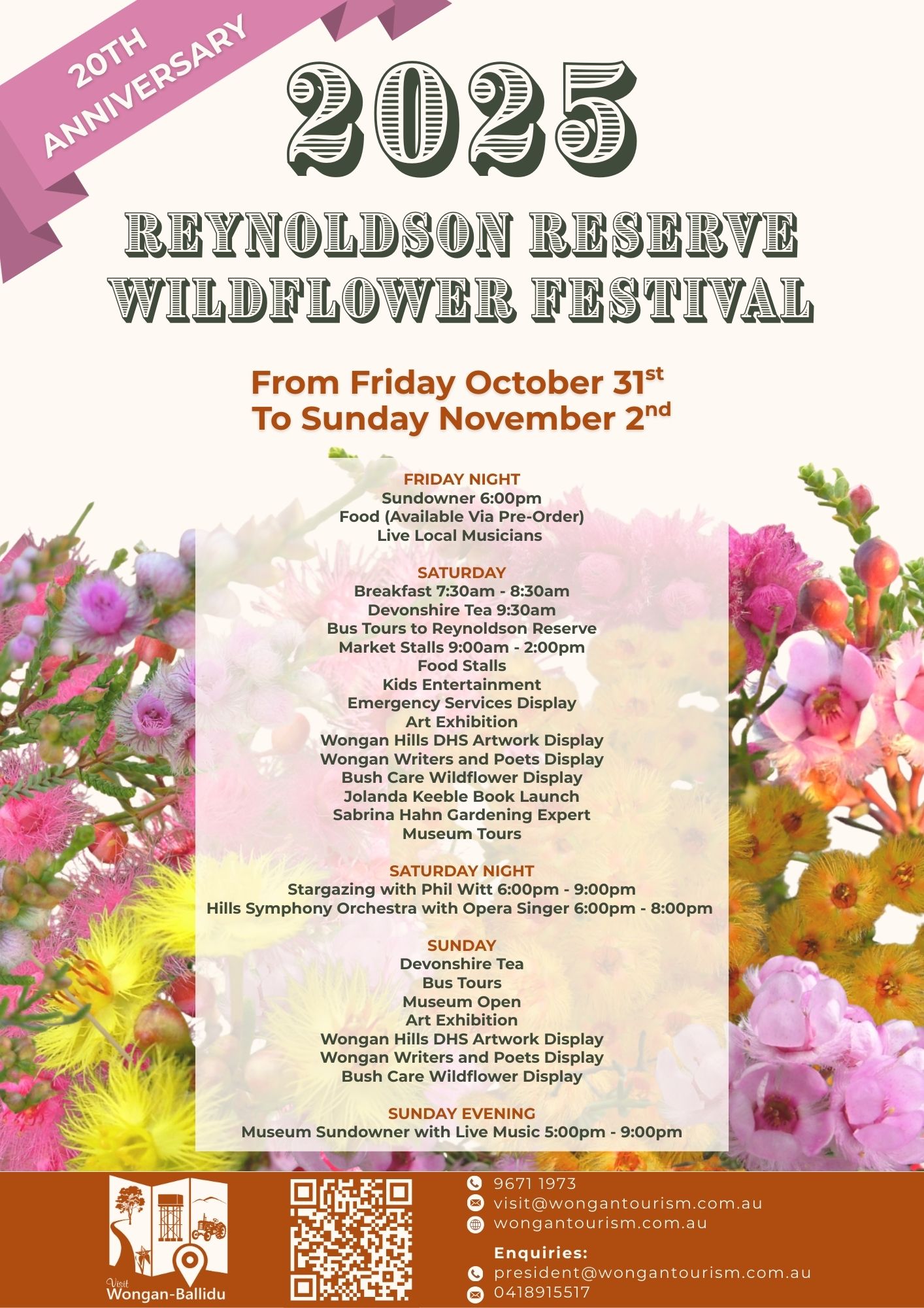 The 2025 Reynoldson Reserve Wildflower Festival will be held on Friday 31st October, Saturday 1st November, Sunday 2nd November in Wongan Hills. This year we will be celebrating our 20th Annual Reynoldson Reserve Wildflower Festival!